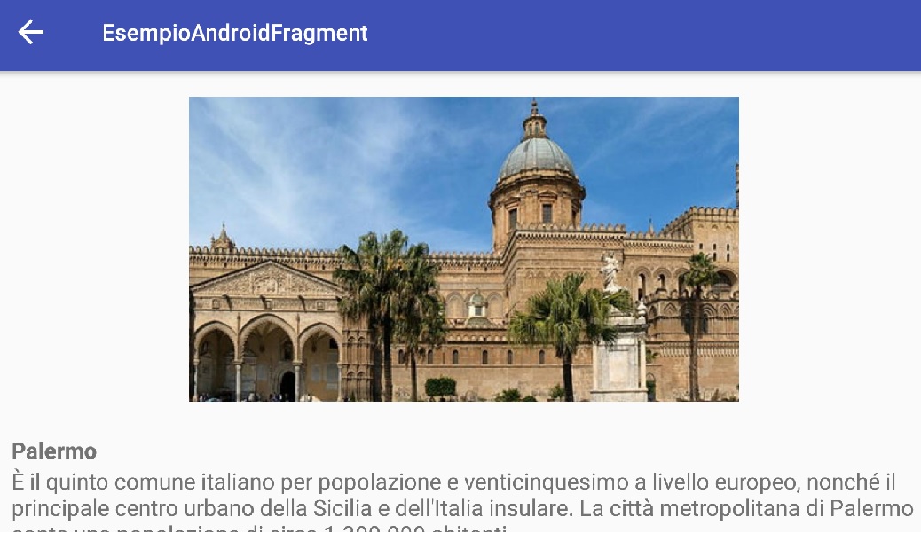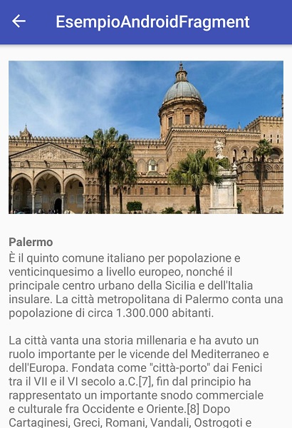 Al click di uno di questi, il Fragment viene sostituito con un secondo che mostra una foto ritraente un luogo simbolo della città in questione accompagnato da un piccolo testo descrittivo (per il quale abbiamo attinto da Wikipedia).