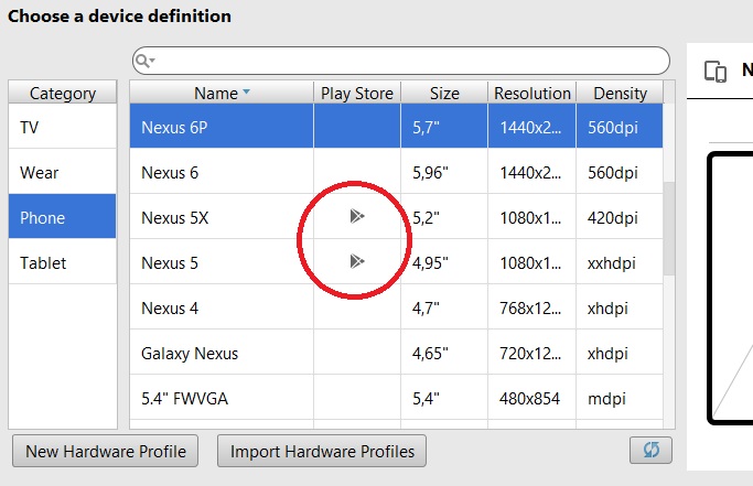 Terminato il download, si può creare l’emulatore e l’Android Virtual Device Manager segnalerà con un’apposita icona quali modelli permettono di avere un emulatore dotato di app client per il Play Store: