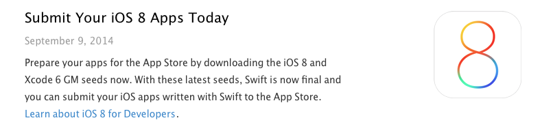 Con una comunicazione ufficiale sul sito degli sviluppatori Apple invita tutti ad inviare i proprio aggiornamenti con supporto ad iOS 8 e le nuove applicazioni disponibili per questo nuovo sistema operativo. È finalmente possibile anche inviare applicazioni scritte con il nuovo linguaggio di programmazione per sviluppare su iOS e OS X: Swift. Importante ricordare che il rilascio della GM è riservato ad iOS, mentre su Mac OS X dovremmo ancora aspettare qualche settimana (si vocifera ottobre…) per poter rilasciare applicazioni con supporto a OS X 10.10, Yosemite.