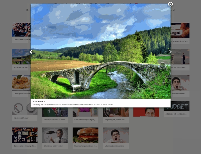 Come si vede in figura, una griglia responsive mostrerà l’insieme di immagini a disposizione mentre il click su una di esse produrrà la visualizzazione di dettaglio in una finestra modale. Per chi volesse invece gustare dal vivo questo plugin, è disponibile una demo live.
