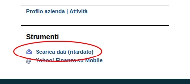 Ad esempio, cercando il titolo relativo all’azienda Mediaset S.p.A. su Yahoo Finanza raggiungeremo la sua pagina (codice MS.MI) e scorrendola verso il basso, sulla destra, scorgeremo il link che permette di scaricare i dati: