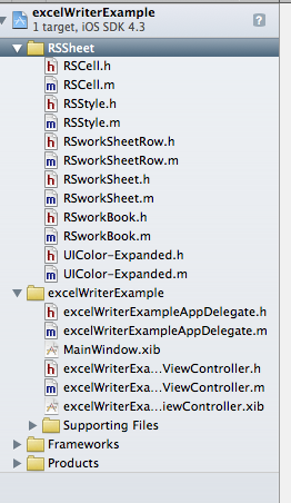 ; RSworkSheetRow * row2 = [[RSworkSheetRow alloc] initWithHeight:24]; RSStyle * styleRow2 = [[RSStyle alloc] init]; styleRow2.font = [UIFont systemFontOfSize:24]; styleRow2.size = 24; styleRow2.color = [UIColor redColor]; styleRow2.alignmentV = RSStyleTopAlign; styleRow2.alignmentH = RSStyleMiddleAlign; row2.style = styleRow2; [row2 addCellNumber:100]; [row2 addCellData:[NSDate date]]; [sheet addWorkSheetRow:row2]; [row2 release]; [styleRow2 release]; [folder addWorkSheet:sheet]; [sheet release]; NSArray *documentPaths = NSSearchPathForDirectoriesInDomains(NSDocumentDirectory, NSUserDomainMask, YES); NSString *documentsDir = [documentPaths objectAtIndex:0]; [folder writeWithName:@"prova" toPath:documentsDir]; [folder release];