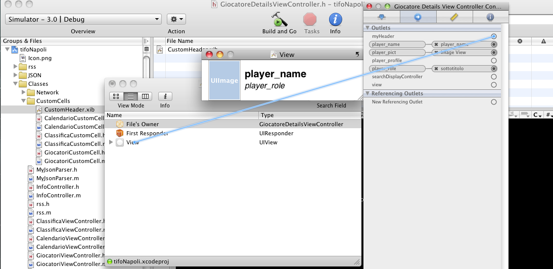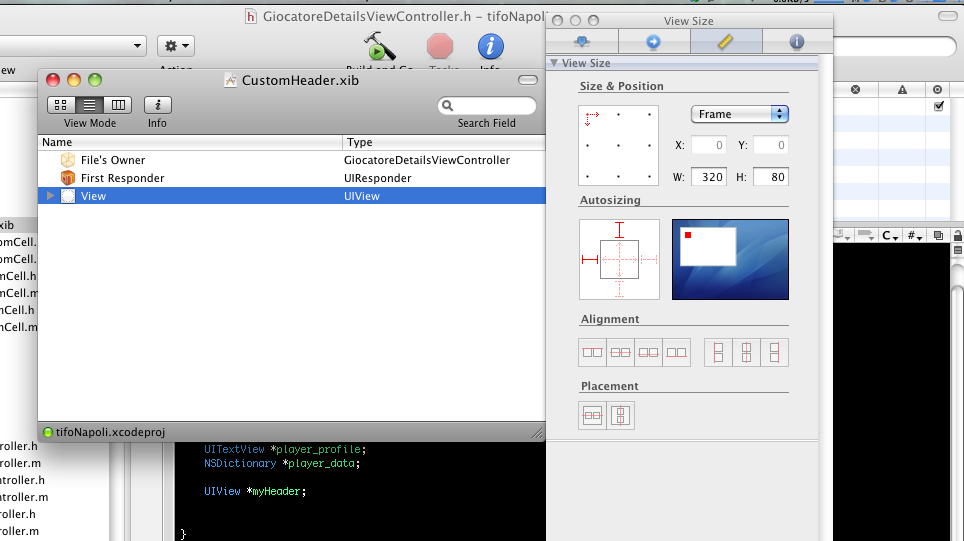 Queste due righe di codice sono facilmente comprensibili, nella prima riga effettuo, dal bundle dell’applicazione, il load del file Nib ( realizzato con IB ) chiamato appunto CustomHeader, mentre nella seconda vado ad assegnare al tableHeaderView ( appartenente alla tabella ) myHeader ( precedentemente dichiarata e collegata alla UIView presente nello XIB )