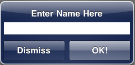 UIAlertView *alert = [[UIAlertView alloc] initWithTitle:@”Enter Name Here” message:@”this gets covered!” delegate:self cancelButtonTitle:@”Dismiss” otherButtonTitles:@”OK!”, nil];