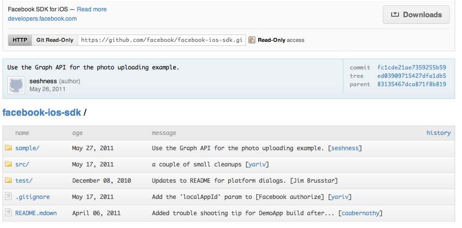 Per fare questo andiamo sulla sezione Mobile Apps del sito developer di facebook e cerchiamo la riga (poco dopo l’inizio del documento) con scritto “Clone the GitHub repository: git clone git://github.com/facebook/facebook-ios-sdk.git”, quindi clicchiamo sul link “GitHub repository” al suo interno. Si aprirà la pagina di GitHub con il progetto.