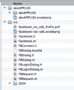 Ritorniamo alla cartella “Facebook-ios-sdk” scaricata precedentemente da GitHub, apriamola e trasciniamo tutta la cartella “src” dentro la cartella principale del nostro progetto (devAPPFacebook). Dovremmo aver ottenuto, a questo punto, una cartella con un contenuto simile a quello mostrato in figura: