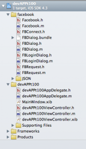 Perfetto, torniamo ad Xcode e tenendo aperta la finestra del finder con la cartella “src” trasciniamo all’interno del nostro progetto tutti i file tranne “facebook-ios-sdk.xcodeproj” e “facebook-ios_sdk_Prefix.pch”. Quando ci verrà chiesto se vogliamo copiare i file diciamo di no (niente spunta su “copy items into destination folder..”), clicchiamo quindi su finish e dovremmo ottenere una gerarchia simile alla seguente: