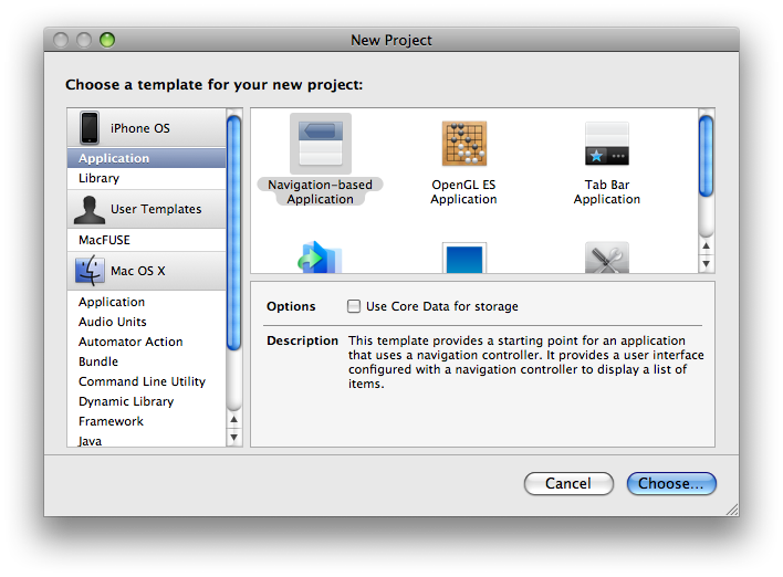 Apriamo Xcode e selezioniamo “File -> New Project”. Nel menù che ci appare selezioniamo “Navigation-based Application”, clicchiamo su “Choose…”, immettiamo come nome “tableViewTutorial” e facciamo clic su “Save”. Abbiamo così creato il nostro nuovo progetto.