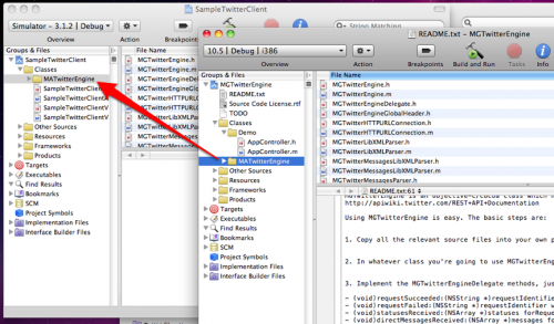 Estraiamo l’archivio ed apriamo il file “MGTwitterEngine.xcodeproj”, un progetto esempio che potete guardare per avere una panoramica della libreria. La procedura che dovete eseguire è spiegata nel file “README.txt” di questo progetto, ma vi illustrerò tutti i passaggi in modo che non abbiate problemi di alcun genere.