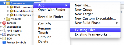 Possiamo chiudere il progetto “MGTwitterEngine” e tornare al nostro “SampleTwitterClient”. Importiamo, ora, il framework che si dovrà occupare del parsing XML. Clicchiamo con il tasto destro sulla cartella “Frameworks” e scegliamo “Add” -> “Existing Frameworks…”: