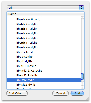 Dall’elenco che appare selezioniamo poi “libxml2.dylib” e clicchiamo su “Add”: