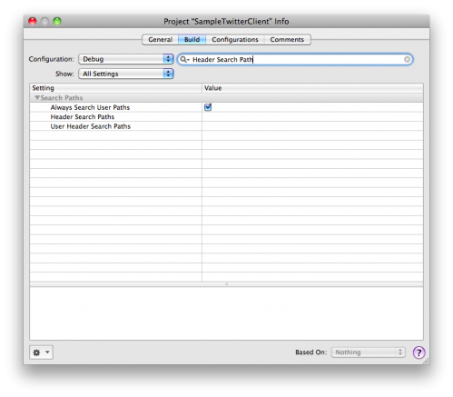 Ci manca solo un’operazione per fare in modo che la libreria “MGTwitterEngine” funzionioni alla perfezione. Facciamo doppio clic sul nome del progetto per aprirne le proprietà. Nella sezione “Build” cerchiamo la voce “Header Search Path”: