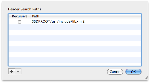 facciamoci doppio clic e quando si apre inseriamoci la stringa “$SDKROOT/usr/include/libxml2” (ci basterà cliccare sul bottoncino “+”):