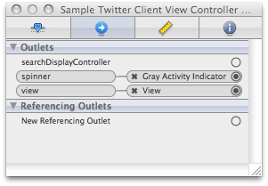 Salviamo la classe e prima di continuare l’implementazione, apriamo nuovamente il file “SampleTwitterClientViewController.xib”, in cui dovremo collegare l’elemento “UIActivityIndicatorView” che abbiamo inserito con quello appena dichiarato nella classe.
