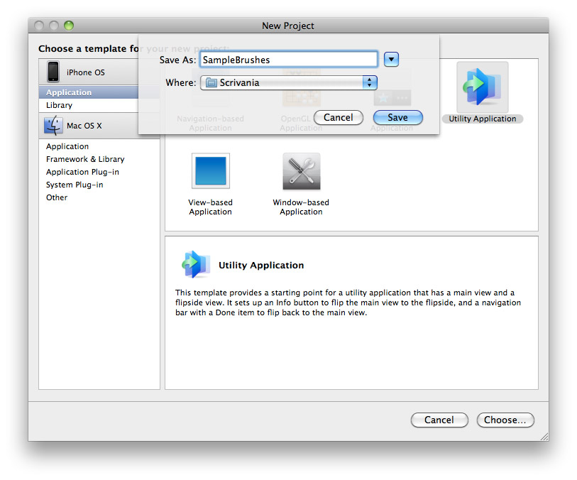 Iniziamo creando il progetto per la nostra applicazione. Create un nuovo progetto edi tipo “Utility Application” e inserite “SampleBrushes” come nome.