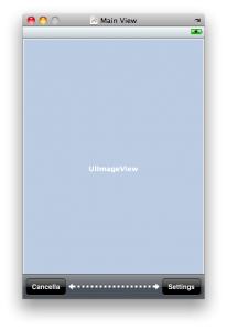 Aggiungete, poi, una UIToolbar sul fondo della vista stessa. Io ho messo come stile della toolbar “Black Translucent”, ovviamente voi potete farla come preferite. Inserite, inoltre, due bottoni “Bar Button Item”, e un “Flexible Space Bar Button Item” tra i due. Il primo bottone rinominatelo in “Cancella” mentre il secondo in “Settings” (Impostazioni è troppo lunga come dicitura xD). Ecco l’aspetto finale della mia applicazione: