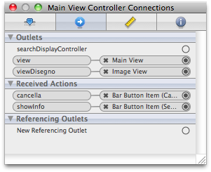 Colleghiamo, ora, l’elemento e le azioni che abbiamo definito poco fa via codice (l’azione “showInfo” era già presente di default). Dal pannello dei documenti selezioniamo “File’s Owner” e spostiamoci in “Connections Inspector”. Colleghiamo “viewDisegno” con la UIImageView che abbiamo inserito, l’azione “cancella” colleghiamola con l’omonimo pulsante, mentre “showInfo” collegatela con il bottone “Settings”. Se avrete eseguito tutto correttamente avrete un pannello delle connesioni come questo: