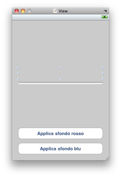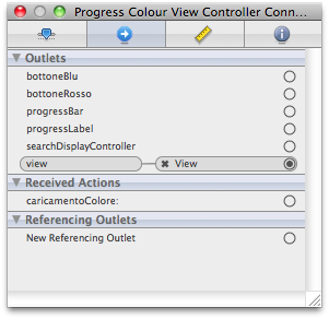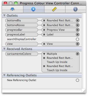 Colleghiamo l’elemento “progressLabel” con la label vuota presente sopra la barra, e “progressBar” con la barra stessa. Colleghiamo anche gli elementi “bottoneBlu” e “bottoneRosso” con i due relativi pulsanti. Colleghiamo, infine, l’azione “caricamentoColore” con entrambi i bottoni, selezionando “Touch Up Inside” dal menù a tendina che si presenta. Se avete eseguito tutto in maniera corretta dovreste avere questo risultato:
