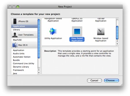 Aprimo Xcode, selezioniamo “File -> New Project”. Nel menù che ci appare selezioniamo “View-based Application”, clicchiamo su “Choose…” e immettiamo come nome “ProgressColour” e fate clic su “Save”. Abbiamo così creato il nostro nuovo progetto.