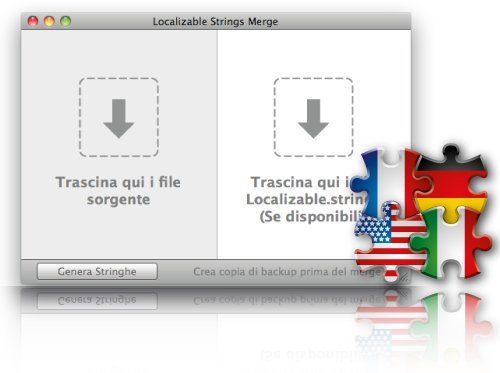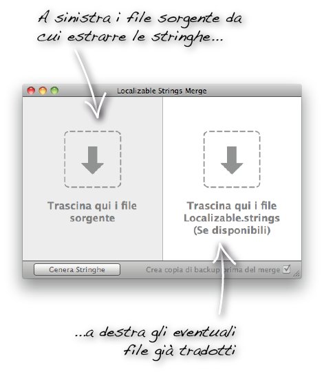 Localizable Strings Merge sostanzialmente esegue la generazione dei file “Localizable.strings” a partire dai file sorgente (in pratica come “genstrings”, ma attraverso un’interfaccia grafica semplice ed elegante) e soprattutto il merge dei file tradotti o parzialmente tradotti.