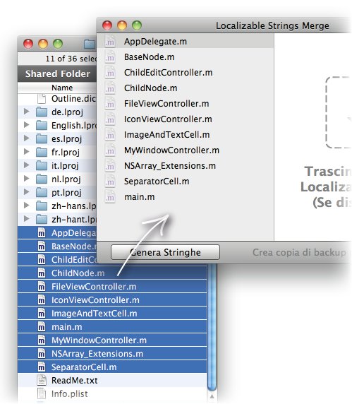 A questo punto, però, al posto di cliccare sul pulsante “Genera Stringhe”, trascineremo nella parte di destra, (via “drag & drop”), i file “Localizable.strings”, uno per ogni lingua, ricevuti dai traduttori. Il pulsante sotto cambierà quindi nome in “Merge Stringhe”: