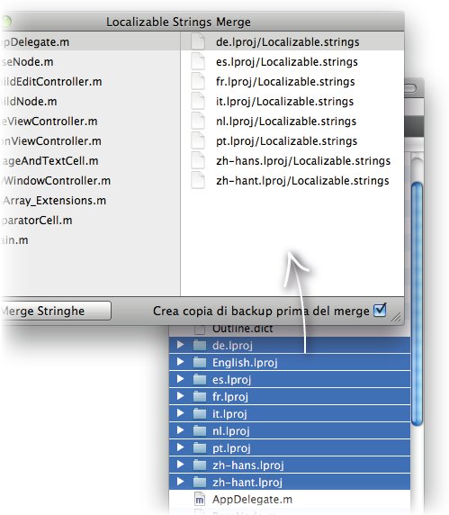 Un semplice click e i file “Localizable.strings” verranno automaticamente aggiornati unendo le stringhe aggiunte nel frattempo ed eliminando quelle tradotte, ma eventualmente non più presenti nei file sorgente. Il nostro consiglio è di lasciare sempre selezionata l’opzione “Crea copia di backup prima del merge”, in tal modo, prima di sovrascrivere un file Localizable.strings, ne viene creata una copia di sicurezza con lo stesso nome a cui viene aggiunta l’estensione .backup.