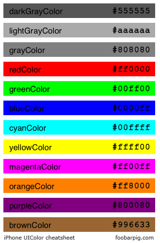 Per comodità vi postiamo una rappresentazione grafica contenente gli UIColor disponibili con il rispettivo codice esadecimale RGB: