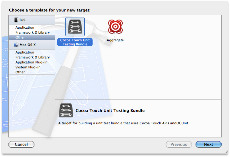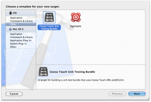Creato il progetto bisogna aggiungere un nuovo unit-test bundle target e per farlo basta selezionare dentro Xcode l’icona del progetto e cliccare sul pulsante “Add target” presente sulla destra. Selezioniamo quindi “Cocoa Touch Unit Testing Bundle” dalla schermata che appare e diamogli un nome significativo.