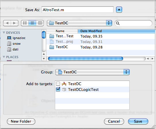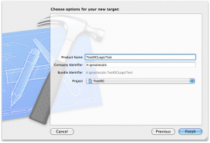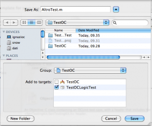 Se la vostra versione di xCode non dovesse aggiungere questa classe basterà aggiungerla manualmente tramite la solita procedura “file -> new->new file” selezionando il tipo “Objective-c Test case Class” e facendo attenzione di spuntare la casella solo per il target di testing.